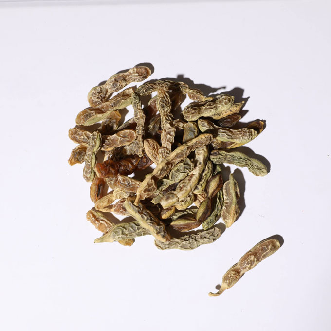 【药材性状】念珠状,长1~6厘米,直径0.6~1厘米。表面黄绿色或黄褐色,皱缩而粗糙,背缝线一侧呈黄色。质柔润,干燥皱缩,易在收缩处折断,断面黄绿色,有黏性。种子1~6粒,肾形,长约8毫米,表面光滑,棕黑色,一侧有灰白色圆形种脐;质坚硬,子叶2,黄绿色。果肉气微,味苦,种子嚼之有豆腥气。