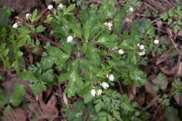 【植物形态】多年生小草本。块根外皮棕黑色。茎直立,1~3条,上部有分枝,被稀疏白色柔毛。基生叶为三出复叶,叶柄茎部扩大呈鞘状,叶片圆形或肾形,小叶扇状菱形或倒卵状菱形,3深裂,两面无毛,下面常带紫色,小叶柄短,有细柔毛;茎生叶较小,互生。花单生叶腋,花柄果后伸长,中部有细苞片2枚;花小,白色;萼片5,花瓣状,卵形;花瓣5,楔形,较萼片稍短;雄蕊通常10,其中有2枚不完全发育;雌蕊3~4,子房狭长,花柱短,向外反卷。瞢荚果3~4枚,熟时开裂;种子细小,倒卵形。花期3~4月,果期5~6月。