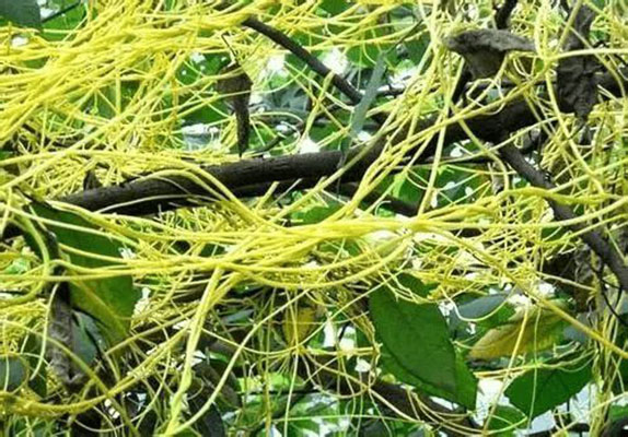 【植物形态】一年生寄生草本。茎纤细呈丝线状,橙黄色,多分枝,缠绕于其他植物体上,随处生吸器,侵入寄主体内。叶退化为三角状小鳞片。花白色,簇生;苞片卵圆形;花萼杯状,先端5裂,裂片卵形或椭圆形;花冠钟形,5浅裂,裂片三角形;雄蕊5枚,花丝短,与花冠裂片互生。雌蕊l枚,子房上位,2室,每室有胚珠2枚,花柱2,柱头头状。蒴果扁球形,长约3毫米,褐色。花期7~9月,果期8~10月。