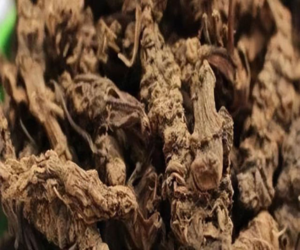 【药材性状】本品根茎呈圆柱形,略扁,稍弯曲,少分枝,长1.5~8cm,直径0.5~2cm;表面暗棕色或灰褐色,有紧密隆起的环节和突起的点状根痕,有的顶端略膨大,具茎、叶残基;质坚实,不易折断,折断面略平坦,黄棕色或灰棕色,可见筋脉点(维管束)断续排列成环。根细长,稍弯曲,长3~15cm,直径约0.2cm,有浅纵皱纹,质脆。气特异,味微苦、辛。