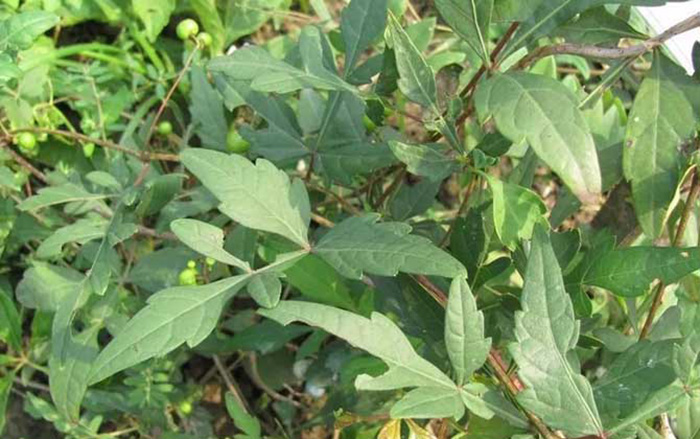 【植物形态】木质藤本。块根矩圆形,数个聚生,外皮红棕色,内面白色或浅红棕色。茎多分枝,带淡紫色,散生点状皮孔,卷须与叶对生。掌状复叶互生,小叶3~5,常羽状分裂,裂片卵形,先端渐尖,边缘疏生粗锯齿,基部楔形,叶轴有阔翅;叶柄带淡紫色。聚伞花序与叶对生,序梗细长而缠绕;花小,萼片5,不明显;花瓣5,淡黄色;雄蕊5枚,与花瓣对生,花丝短;花盘杯状,边缘稍分裂;子房2室,花柱甚短。浆果圆球形或肾形,熟时蓝色。花期7~8月,果期9~10月。