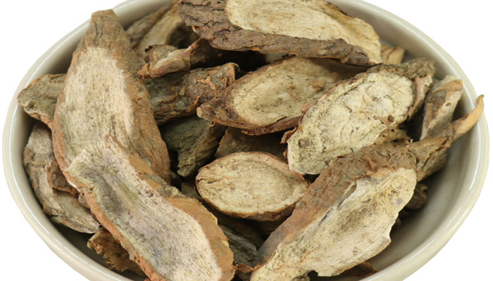 【药材性状】本品纵瓣呈长圆形或近纺锤形,长4~10cm,直径1~2cm。切面周边常向内卷曲,中部有1突起的棱线。外皮红棕色或红褐色,有纵皱纹、细横纹及横长皮孔,易层层脱落,脱落处呈淡红棕色。斜片呈卵圆形,长2.5~5cm,宽2~3cm。切面类白色或浅红棕色,可见放射状纹理,周边较厚,微翘起或略弯曲。体轻,质硬脆,易折断,折断时,有粉尘飞出。气微,味甘。