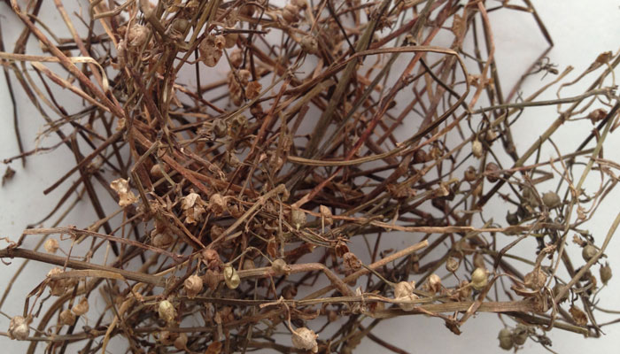 【药材性状】白花蛇舌草的全草扭缠成团状,灰绿色或灰棕色。有主根1条,须根纤细。茎细而卷曲,质脆易折断,中央有白色髓部。叶多破碎,极皱缩,易脱落;有托叶。花腋生,多具梗。气微,味淡。