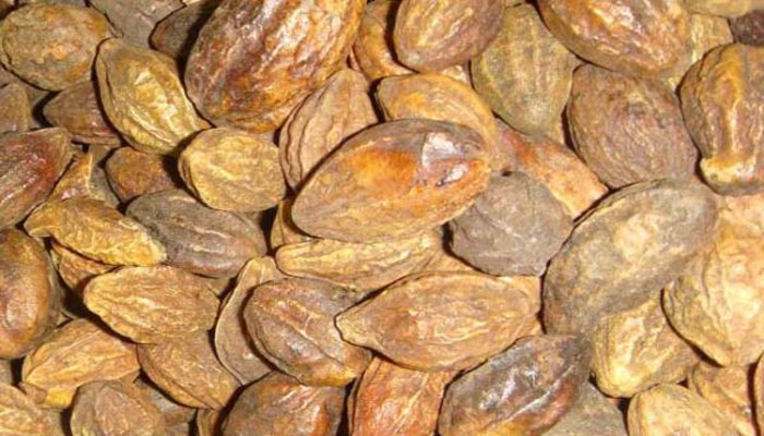 【药材性状】本品呈卵形或椭圆形,长2~3.8cm,直径1.5~3cm。表面棕褐色,被细密绒毛,基部有残留果柄或果柄痕。具5棱脊,棱脊间平滑或有不规则皱纹。质坚硬。果肉厚2~5mm,暗棕色或浅绿黄色,果核淡棕黄色。种子1,种皮棕黄色,种仁黄白色,有油性。气微,味涩、苦。