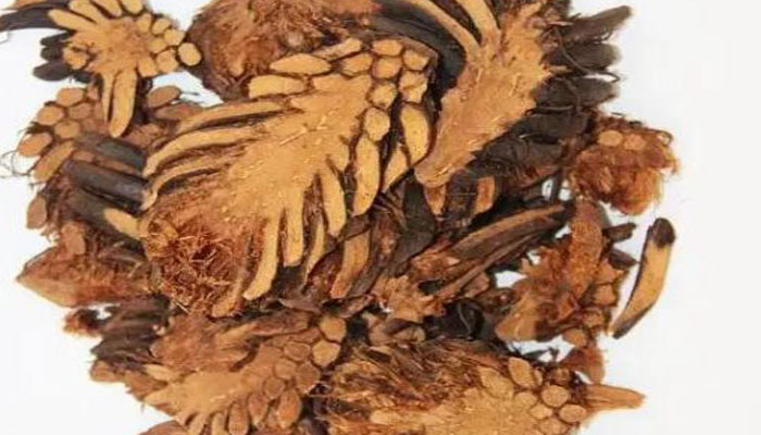 【药材性状】本品呈长倒卵形,略弯曲,上端钝圆或截形,下端较尖,有的纵剖为两半,长7~20cm,直径4~8cm。表面黄棕色至黑褐色,密被排列整齐的叶柄残基及鳞片,并有弯曲的须根。叶柄残基呈扁圆形,长3~5cm,直径0.5~1.0cm;表面有纵棱线,质硬而脆,断面略平坦,棕色,有黄白色维管束5~13个,环列;每个叶柄残基的外侧常有3条须根,鳞片条状披针形,全缘,常脱落。质坚硬,断面略平坦,深绿色至棕色,有黄白色维管束5~13个,环列,其外散有较多的叶迹维管束。气特异,味初淡而微涩,后渐苦、辛。