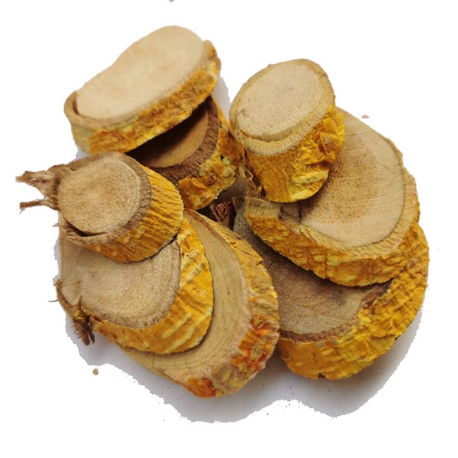 【药材性状】根圆柱形,长短不一,直径1.5~2.5厘米;或已切成圆形厚片。外皮黄色或橙红色,具显著的纵皱纹及少数须根痕。栓皮薄而易脱落。质地坚硬,不易折断,断面皮部薄,灰黄色,具韧性纤维,木部占绝大部分。黄色,柴性,导管孔明显,有的中央部位有小髓。气微,味淡。