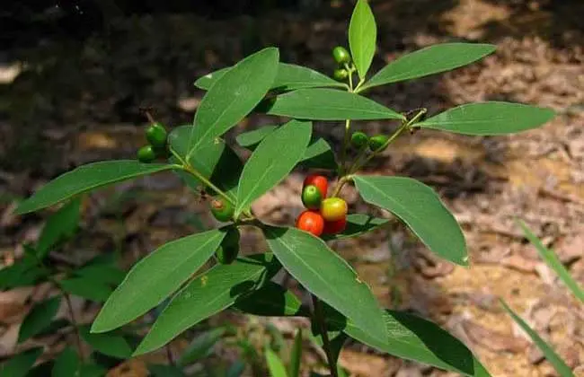 【植物形态】半常绿小灌木,高达1米。全株平滑无毛。茎直立,多分枝,幼枝红褐色。根皮和茎皮富含绵状纤维,不易折断。叶对生,几无柄;叶片倒卵形至长椭圆形,长2~5厘米,宽0.8~1.5厘米,先端钝或短尖,全缘,基部楔形,侧脉多数,极纤细,干时褐色。花黄绿色,数花簇生于枝顶,排成聚伞状伞形花序或呈近无柄的头状花序;花两性,无苞片,花被管状,先端4裂,无毛;雄蕊8,成上下两轮着生花被管内,花丝短,花药椭圆形;子房倒卵形或长椭圆形,具圆头状柱头。核果卵形或椭圆形,熟时鲜红色。花果期夏、秋季。