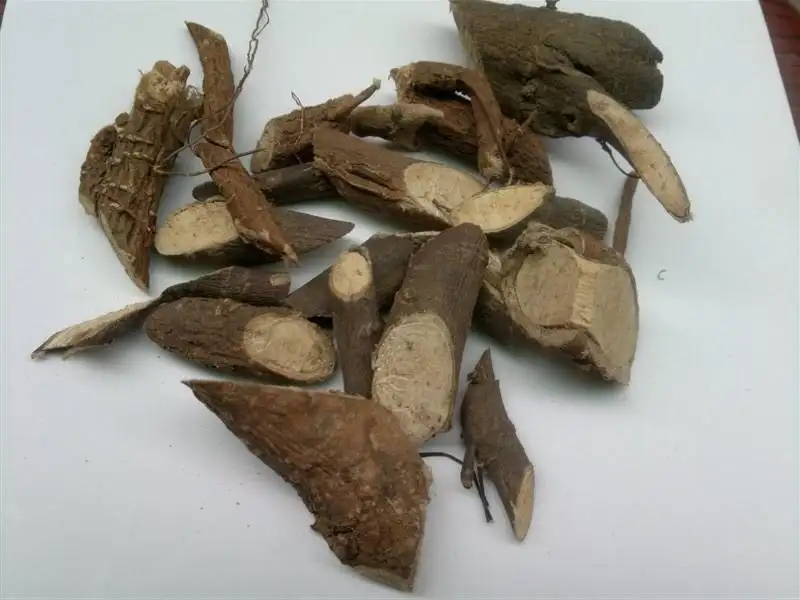 【药材性状】根圆柱形或有分枝,长达40厘米,直径0.5~3厘米。表面黄棕色至灰棕色,具不规则纵皱纹和横向皮孔及稍突起的支根痕。质坚韧,断面皮部厚1.5~4毫米,类白色,易与木部分离,有众多绵毛状纤维;木部淡黄色,有放射状纹理。气微,味微苦,久嚼有持久的灼热不适感。以条粗、皮厚者为佳。