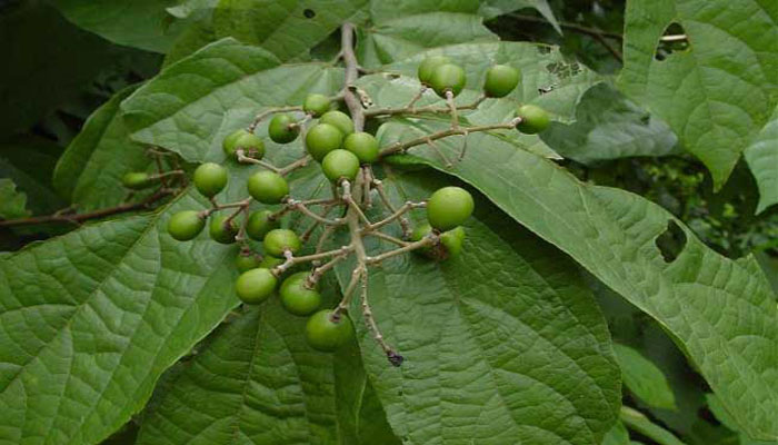 【植物形态】灌木或小乔木。树皮灰黑色。单叶互生,纸质,卵形或卵状长圆形,顶端渐尖,基部浑圆,幼叶两面均被星状柔毛,后无毛或近无毛,边缘有小锯齿,基出脉3条,网脉很明显,叶柄粗壮长;托叶线状披针形,长约为叶柄之半。圆锥花序顶生或生于上部叶腋内,花序和花梗均密被灰黄色星状柔毛;萼片5枚,长圆形,被星状柔毛;花瓣5片,长圆形,两面均被毛;雄蕊多数,离生;子房近球形,无毛。核果近球形或倒卵状圆球形,黑褐色,无毛。