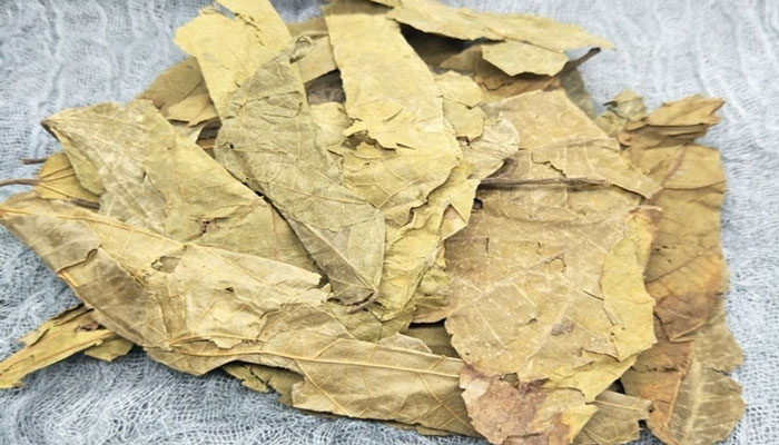 【药材性状】本品多皱缩或破碎。完整叶展平后呈卵状长圆形或卵状矩圆形,长8~18cm,宽4~8cm。表面黄绿色、绿褐色或黄棕色。先端渐尖,基部钝圆,稍偏斜,边缘具细齿。基出脉3条,侧脉羽状,小脉网状。具短柄,叶脉及叶柄被柔毛。纸质,易破碎。气微,味淡,微酸涩。