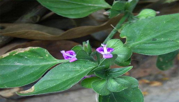 【植物形态】:是爵床科狗肝菜属草本植物,高80厘米。茎外倾或上升,节常膨大膝曲状。叶卵状椭圆形,先端短渐尖,基部宽楔形或稍下延。花序腋生或顶生,总苞片宽倒卵形稀披针形被柔毛,花冠淡紫红色被柔毛。蒴果被柔毛。