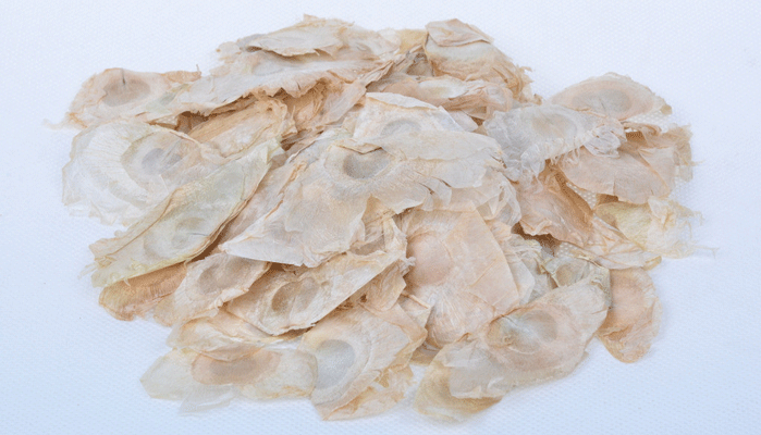【药材形态】木蝴蝶为蝶形薄片,除基部外三面延长成宽大菲薄的翅,长5~200px,宽3.5~112.5px。表面浅黄白色,翅半透明,有绢丝样光泽,上有放射状纹理,边缘多破裂。