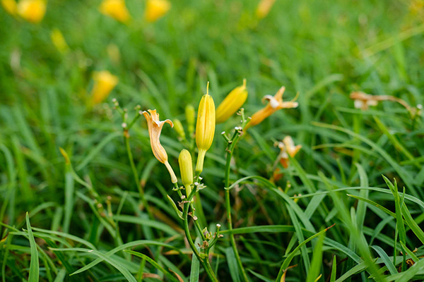 【植物形态】多年生草本,高30~90厘米。根茎极短,丛生多数肉质纤维根及膨大呈纺锤形的块根。叶基生,线形,长达60~100厘米,宽2.5~4厘米,先端渐尖,基部抱茎,全缘,主脉明显,在背面凸出。花茎圆柱状,自叶丛抽出,高出叶面;花6~10余朵,集成伞房花序,两歧;苞片短卵状三角形;花梗长约2厘米;花大,橘红色或黄红色,无香味,长7~12厘米;花被下部管状,长约2.5厘米,上部钟状,6裂,裂片长椭圆形,排列为2轮,外轮3片,宽1.2~1.8厘米,内轮2片,宽约2.5厘米,边缘稍呈波状,脉纹分枝或接合;雄蕊6,突出花被外,花丝线状,花药多少丁字形;子房长圆形,3室。蒴果长圆形,长5~10厘米,具钝棱,成熟时开裂。种子有棱角,黑色,光亮。花期6~7月。